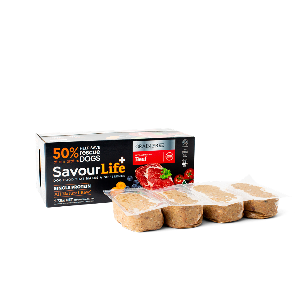 SavourLife’s All Natural Raw Frozen dog food consists primarily of raw meat, a rich source of amino acids which play a key part in many bodily functions like supporting muscle activity, transporting nutrients and oxygen around the body, building and repairing tissue as well as supporting the immune system. Finely ground beef bone and cartilage provide a natural source of phosphorus and calcium that is important for many functions including healthy teeth and bones. Offal including Beef heart and liver is a good source of iron which helps create red blood cells in the body.