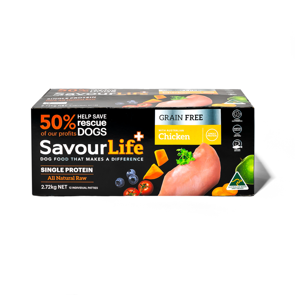 Our All Natural Raw Adult Chicken Frozen dog food, is a Single Protein meal that is filled with the finest natural Australian ingredients. With superfood inclusions like blueberries, broccoli, tomatoes, carrot, apples and flaxseeds; plus vitamins, minerals, natural pre-biotics, probiotics and amino acids. Plus, it’s grain free, gluten free and hypoallergenic, and contains no artificial colours, flavours or preservatives.