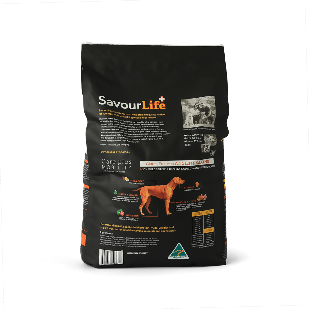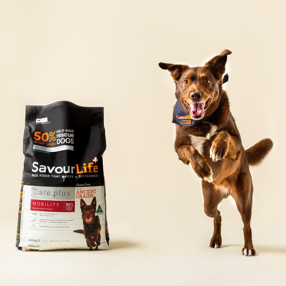 SavourLife’s Care Plus Mobility with Ancient Grains dog food may assist with your dog’s joint and muscle health and overall mobility.
