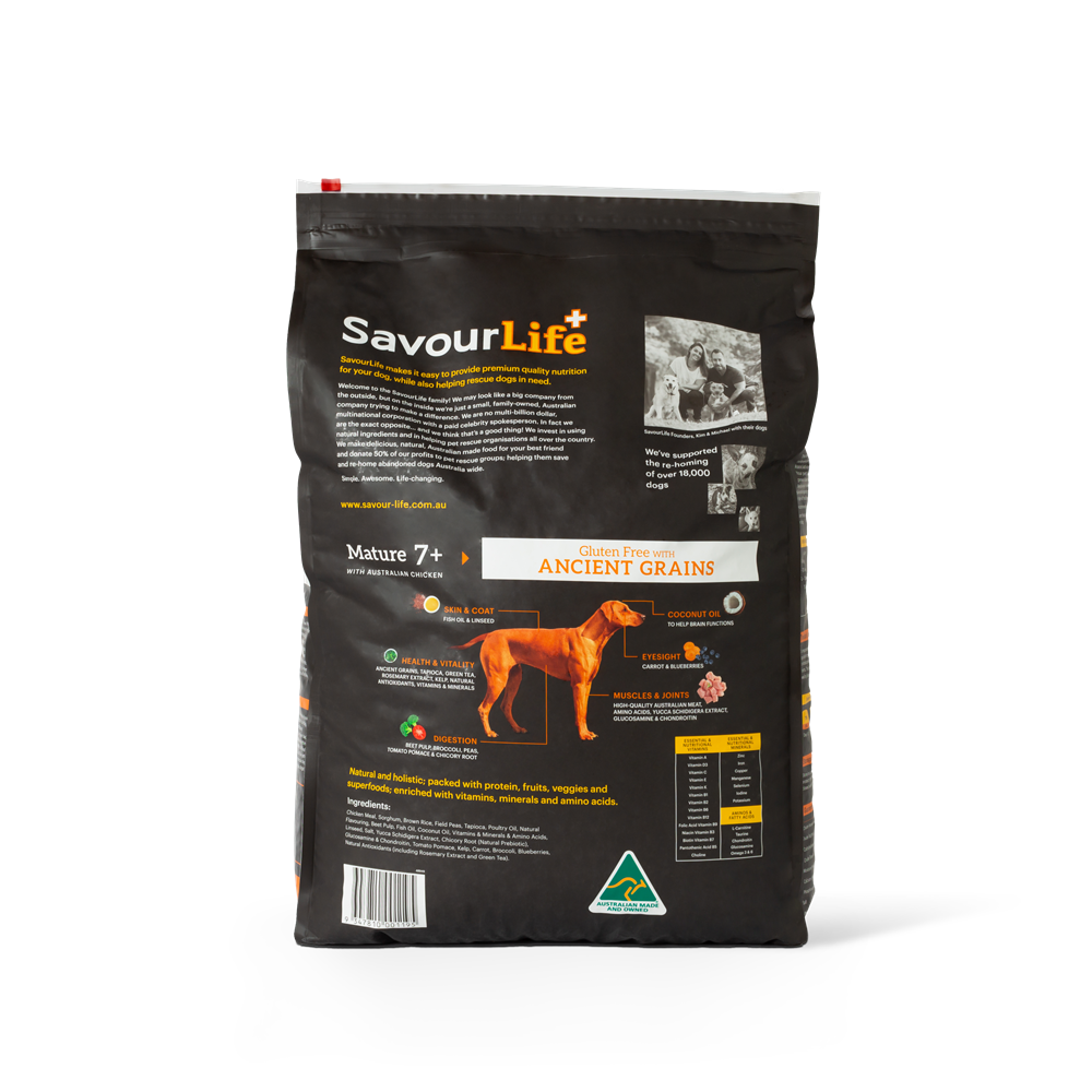 SavourLife’s Ancient Grains Mature 7+ with Australian Chicken is an all-natural, holistic, Australian-made, gluten-free dog food with natural superfood inclusions like chicory and kelp. It's bursting with single-source Australian meat plus vitamins, minerals, natural prebiotics and amino acids