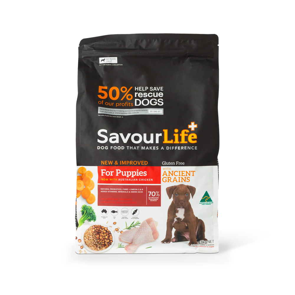 The first months of a puppy’s life are crucial to their long-term health and well-being. Puppies require more nutrients and energy than older dogs to help them grow into the best dog they can be. With all the healthy vitamins, minerals and nutrients to ensure your puppy’s development; SavourLife’s Ancient Grains for Puppies with Australian Chicken is an all-natural, holistic, Australian-made, gluten-free puppy food with natural superfood inclusions.