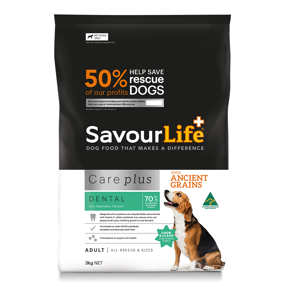 SavourLife’s Ancient Grain Care Plus Dental with Australian Chicken is the latest instalment into our functional-health Care Plus range. Crafted for adult dogs of all breeds and sizes, Ancient Grain Dental is designed to provide complete dental support of teeth and gums, whilst delivering the same high-quality nutrition which Ancient Grain is known for.