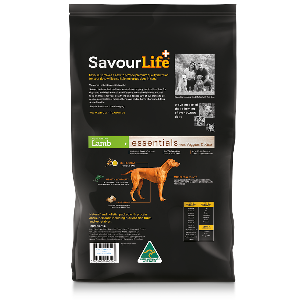 SavourLife Essentials Australian Lamb with Veggies & Rice is an all-natural, Australian-made food; made with a minimum of 60% protein sourced from high-quality Australian meat. It’s packed with natural prebiotics, fibre, omega 3 & 6, plus added vitamins, minerals, and amino acids to support the nutritional needs of adult dogs. There are absolutely no artificial flavours, colours or preservatives.