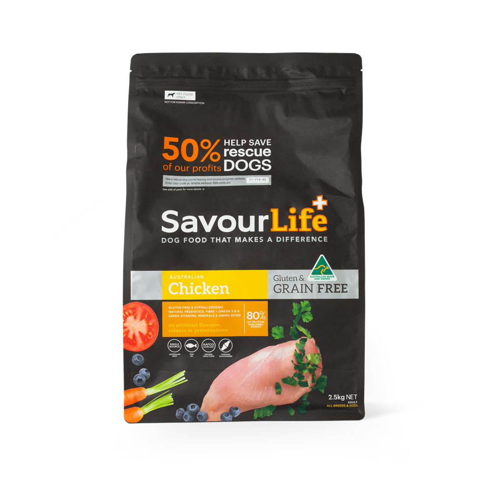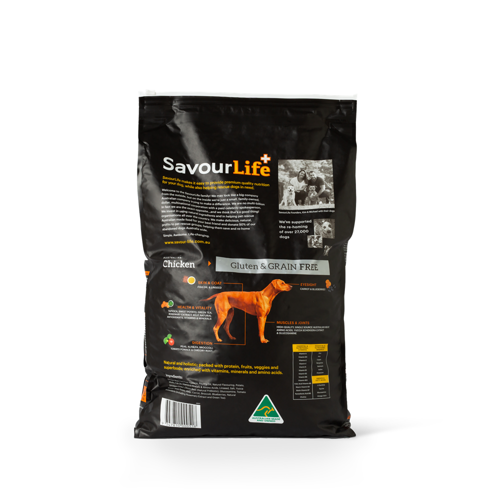 SavourLife’s Grain-Free Chicken is an all-natural, holistic, Australian-made/Australian meat, grain-free, gluten-free dog food with natural superfood inclusions like Sweet Potato, Yucca, Kelp, Carrot, Broccoli and Blueberries; plus vitamins, minerals, natural pre-biotics and amino acids.