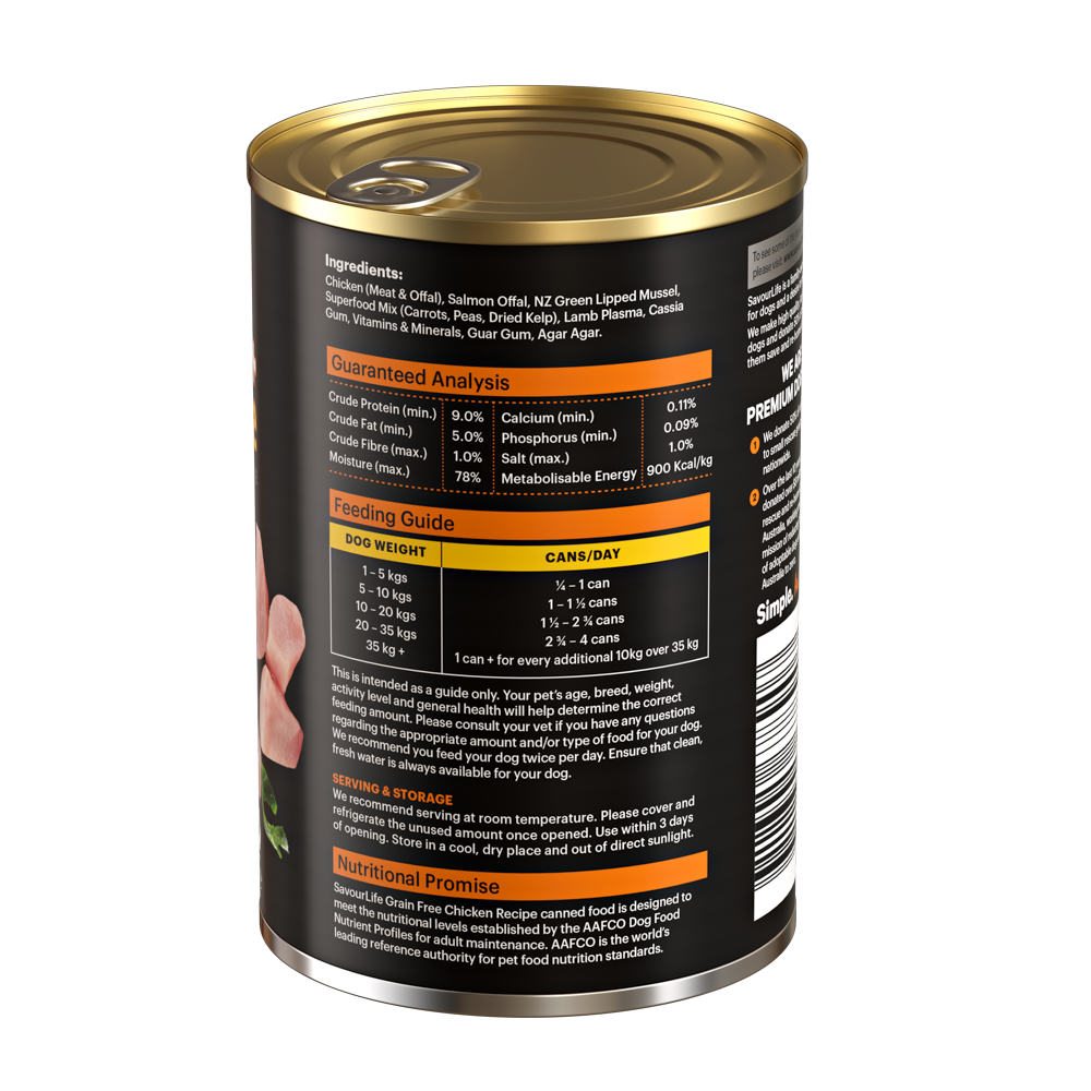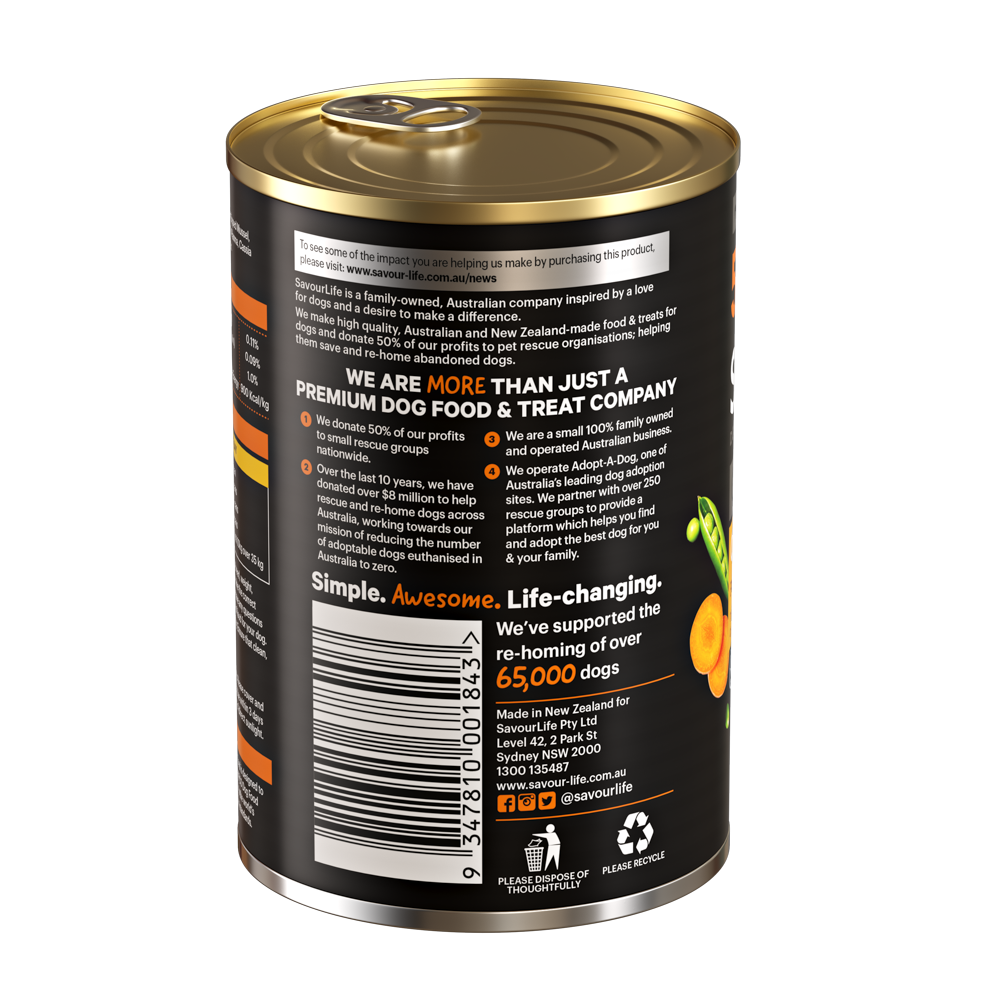 SavourLife's Grain Free canned dog food recipes have been specially batched to consist of 95% Meat, Organs, New Zealand Green Lipped Mussel and Superfoods; and topped with all the essential vitamins & minerals to create a complete and balanced meal. The result is an irresistibly tasty, loaf-like meaty food that is packed with nutrients that closely mimic your dog’s ancestral diet ensuring they thrive every day.