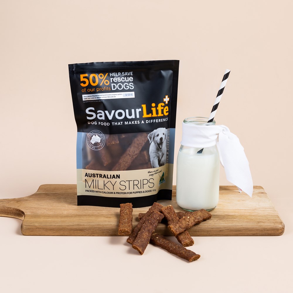 SavourLife's delicious Australian Milky Strips are made from real Australian milk and chicken! They are enriched with essential vitamins and minerals to help your puppy's development and the addition of fish oil gives a natural boost of vital Omega 3 & 6 for a shiny and healthy coat. We use a special drying process to capture the natural goodness and their naturally chewy texture is great for promoting healthy teeth and gums. They are packed with protein and calcium for strong teeth and bones. A delicious, healthy treat for puppies and dogs of all shapes and sizes. There are no artificial flavours and absolutely no colourings!