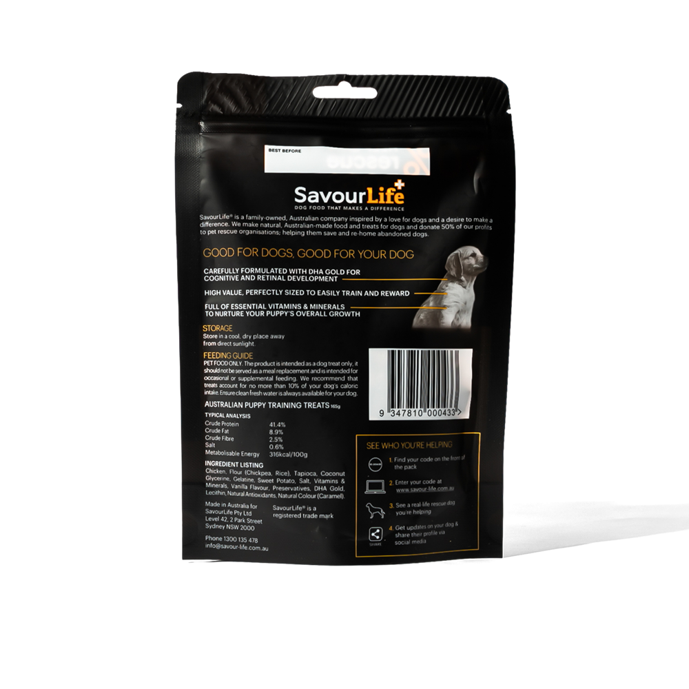 SavourLife’s first puppy specific Puppy Chicken Training Treat is packed full of meaty goodness and inclusions like DHA GOLD aimed at helping your puppy grow and develop to be the best dog they can be. Expanding on our extremely popular Training Treats range, our treats made right here in Australia from real Australian meat and all natural ingredients. This ensures your puppy is getting nothing but the best. Great to have on hand when you are walking, training or just having fun! We have done the hard work for you! These tasty morsels are perfectly sized in little cubes to easily train and reward. No more cutting up meat or trying to break treats with your hands! Our Puppy Chicken Training Treats with DHA GOLD are high-value; that’s training speak for ‘your dog will do anything for the taste!’ Not only do dogs love them, they are healthy too! They are enriched with DHA GOLD that aids with your puppies cognitive and retina development. Made with Australian Chicken that is great for fussy eaters while being gentle on tummies. Sweet Potato, which puppies not only love the taste of, are also rich in beta-carotene, a mineral essential in the supported development of bone growth, skin and vision. Vitamins and minerals that support the creation of the bodies essential building blocks. As an added bonus they are low in fat and salt.